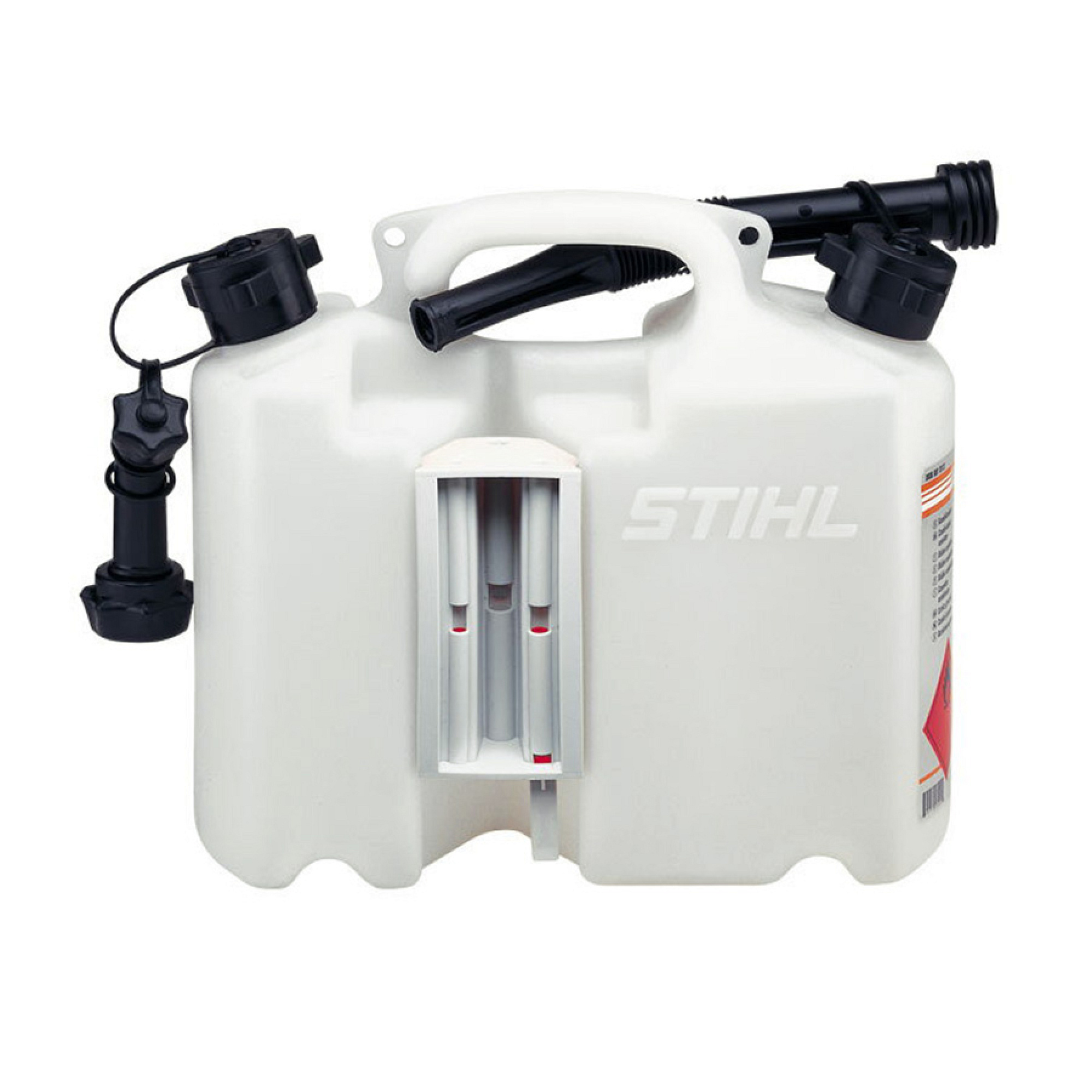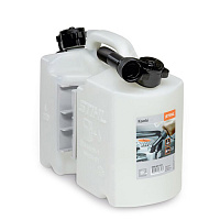 K přepravě 5 l paliva a 3 l adhezního oleje pro pilový řetěz.Včetně 1 vylévací trubky na benzin.
