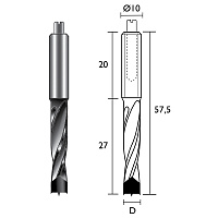 Provedení: Vysoce kvalitní jemnozrný slinutý karbid, středicí hrot, dva negativní předřezávací břity. Stavěcí šroub pro přesné ustavení. Doporučené otáčky: 3.000-6.000 ot/min. Použití: Ve vícevřetenových kolíkovacích strojích a CNC strojích. Pro vrtání neprůchozích děr do masivního dřeva, lepených laminovaných desek a dřevěných kompozitů.