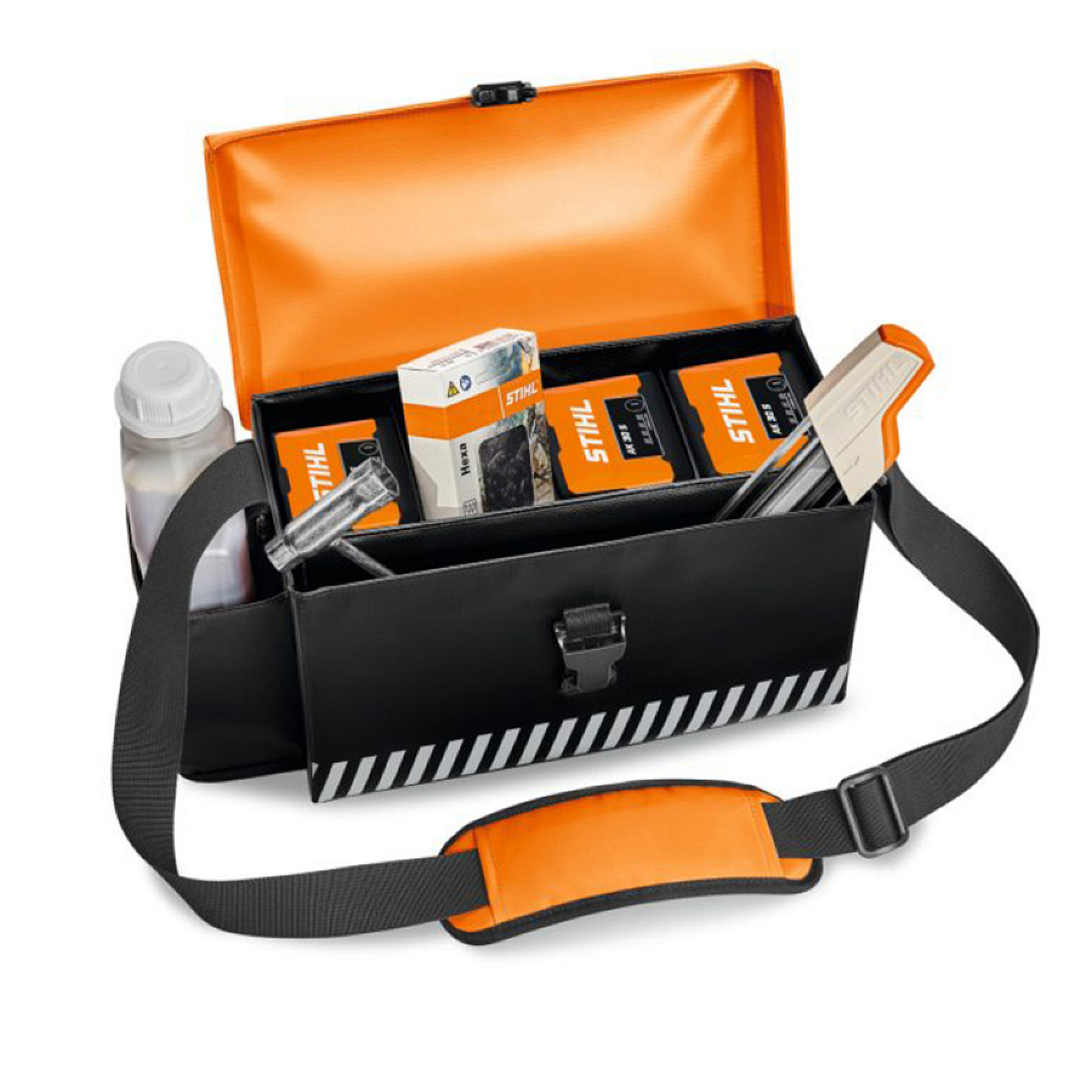 Kombinovaná taška STIHL na akumulátory a oleje usnadňuje přepravu provozních materiálů a příslušenství pro akumulátorové pily.