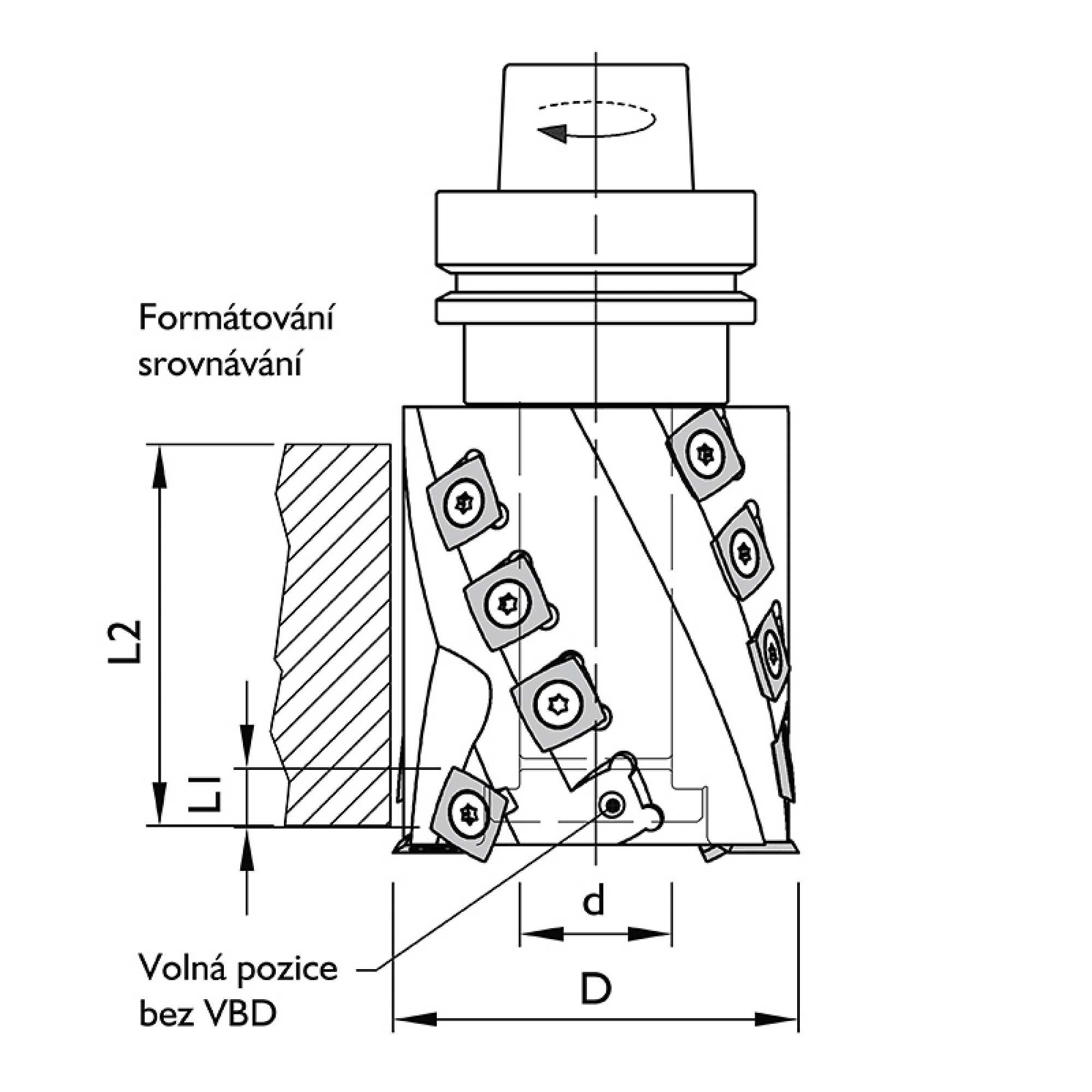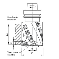 Provedení: HW-VBD R50; Z2 = 4 spirály. Použití: pro CNC obráběcí centra Max. otáčky: 16 000 ot/min. Upínací trn s kuželem HSK F63 je součástí nástroje. Určeno: k příčnému i podélnému formátování, orovnávání a falcování. Obráběný materiál: měkké a tvrdé dřevo, překližka, Multiplex, vícevrstvé lepené dřevo. Tělo nástroje z pevnostní slitiny hliníku. Axiálně uložené destičky HW-VBD 4 řezné hrany s rádiusem R50 (obvod) zajistí vysokou kvalitu opracování. Čelní předřezové nože umožňují čisté frézování falců, polodrážek. Provedení: Z2 = 4 spirály zajistí malé třísky usnadňující průchod odsáváním.